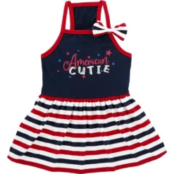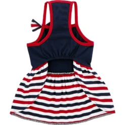 - Patriotic stripe print pet dress with bow is perfect for any outdoor celebration.